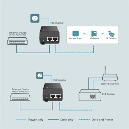 | Interfaz | - 1 x puerto de entrada de datos RJ45 de 10/100/1000 Mbps - 1 x puerto RJ45 de alimentación + salida de datos a 10/100/1000 Mb |