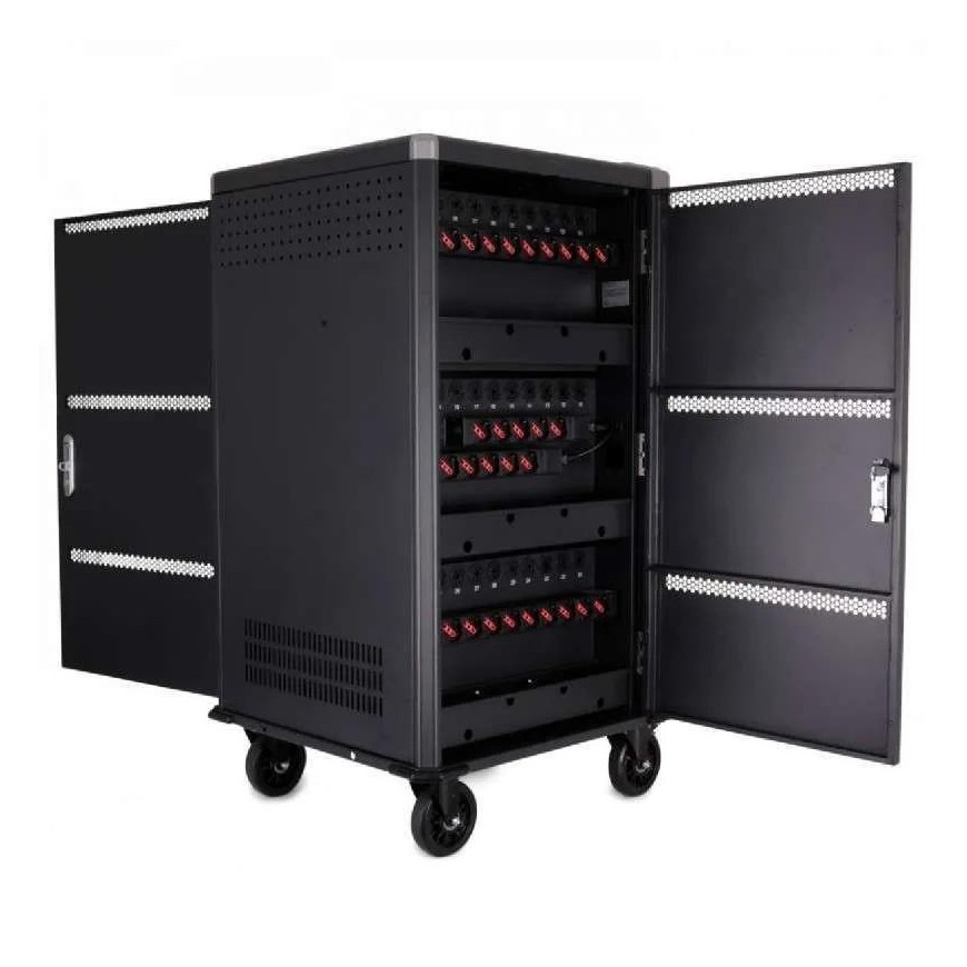 Armario de Transporte Metálico: Diseñado para alojar hasta 30 dispositivos electrónicos, este armario cuenta con ruedas con freno para fácil movilidad, estanterías ordenadas, y seguridad mejorada con cerraduras y protección eléctrica. Ideal para escuelas y oficinas, ¡mantén tus dispositivos organizados y seguros!