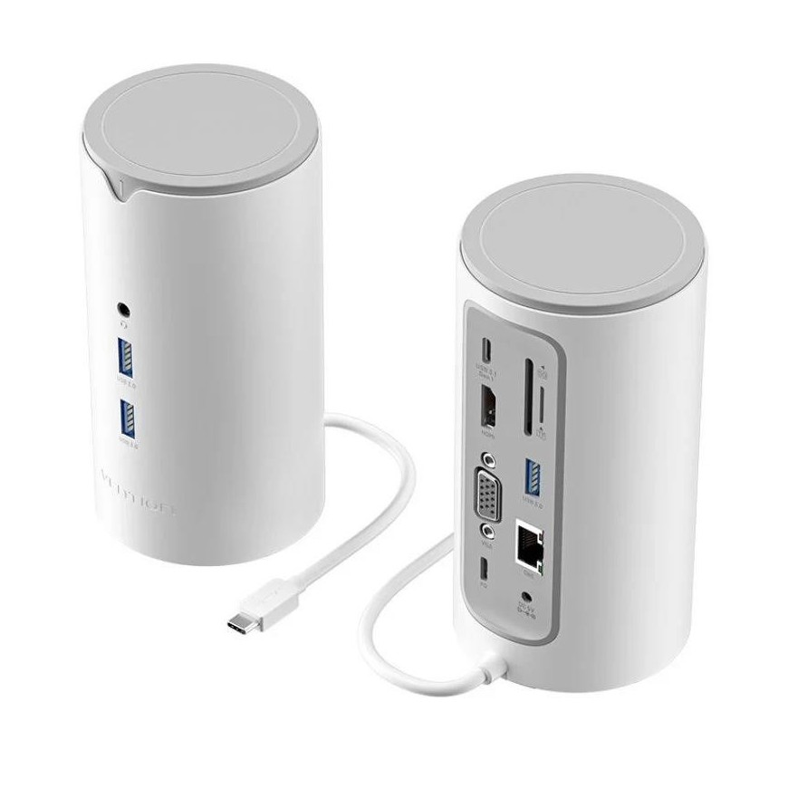 La Docking Station 12 en 1 está equipado con 1 puerto USB-C, 1 puerto HDMI, 1 puerto VGA, 1 puerto USB C 3.1 Gen 1, 3 puertos USB A 3.0, 1 puerto RJ45 , 1 Slot tarjetas SD, 1 Slot tarjetas TF, 1 puerto de audio TRRS 3.5mm , 1 puerto PD y un puerto 1 de alimentación DC.