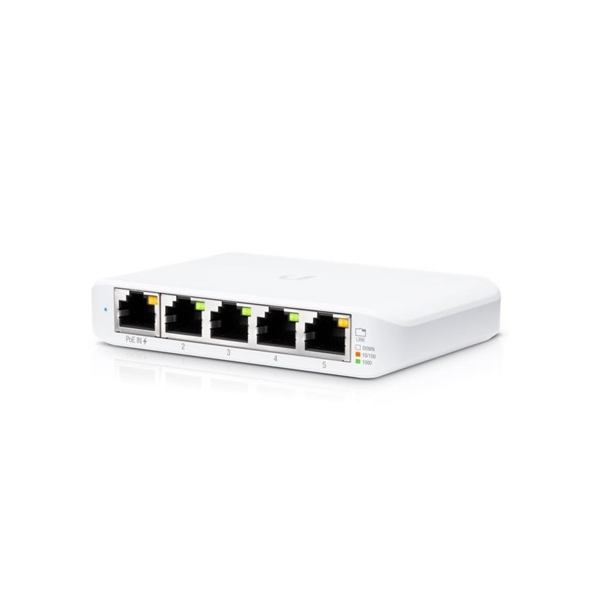Construya y expanda su red con el conmutador UniFi®, parte del sistema empresarial UniFi de Ubiquiti Networks®. El conmutador UniFi, modelo USW-Flex-Mini, es un conmutador Gigabit administrado de forma inteligente. Ofrece 5 puertos Ethernet RJ45, proporcionando enlaces de 1 Gigabit a sus dispositivos.