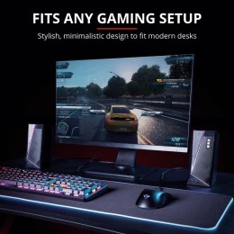Gracias a su diseño estilizado y a la sutil iluminación RGB, el juego de auriculares GXT 609 Zoxa de Trust es un complemento elegante para cualquier escritorio. Además, este juego de altavoces estéreo es fácil de usar y ni siquiera requiere un enchufe de pared. Se enciende automáticamente al encender el PC.