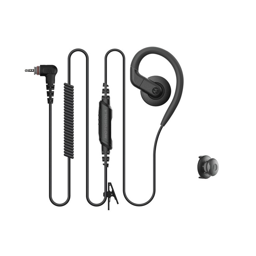 Auricular Motorola PMLN8078A (59PMLN8078A) tipo “over-ear” de un solo pin (2,5 mm) con PTT y micrófono en línea, pensado para uso cómodo y manos libres con radios CLPe/CLP446e.