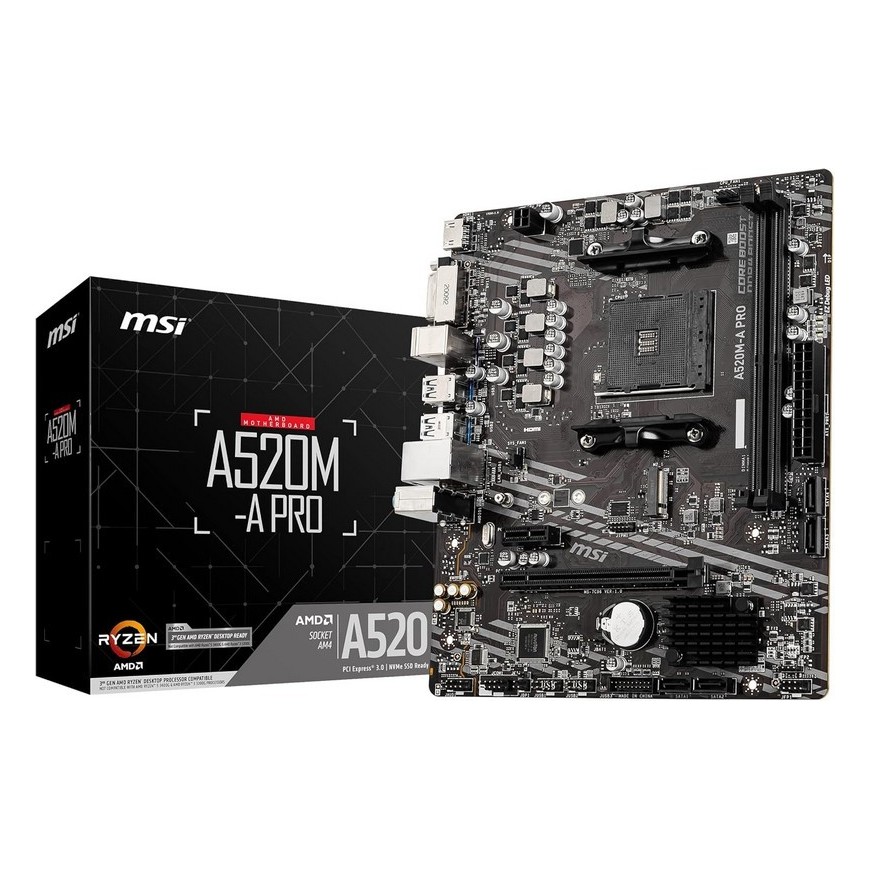 Placa base MSI A520M-A PRO (socket AM4, formato Micro-ATX) con chipset AMD A520, soporte para procesadores Ryzen de 3.ª y 5.ª generación, HDMI/DVI y soporte para memoria DDR4.
