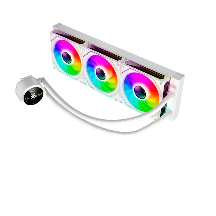 El IceBurg 360V Digital WH es un sistema de refrigeración líquida AIO de 360 mm en acabado blanco, diseñado para ofrecer alto rendimiento térmico hasta 290 W TDP con un funcionamiento silencioso y estable. Integra bomba y ventiladores ARGB sincronizables, control PWM inteligente y amplia compatibilidad con plataformas Intel y AMD.