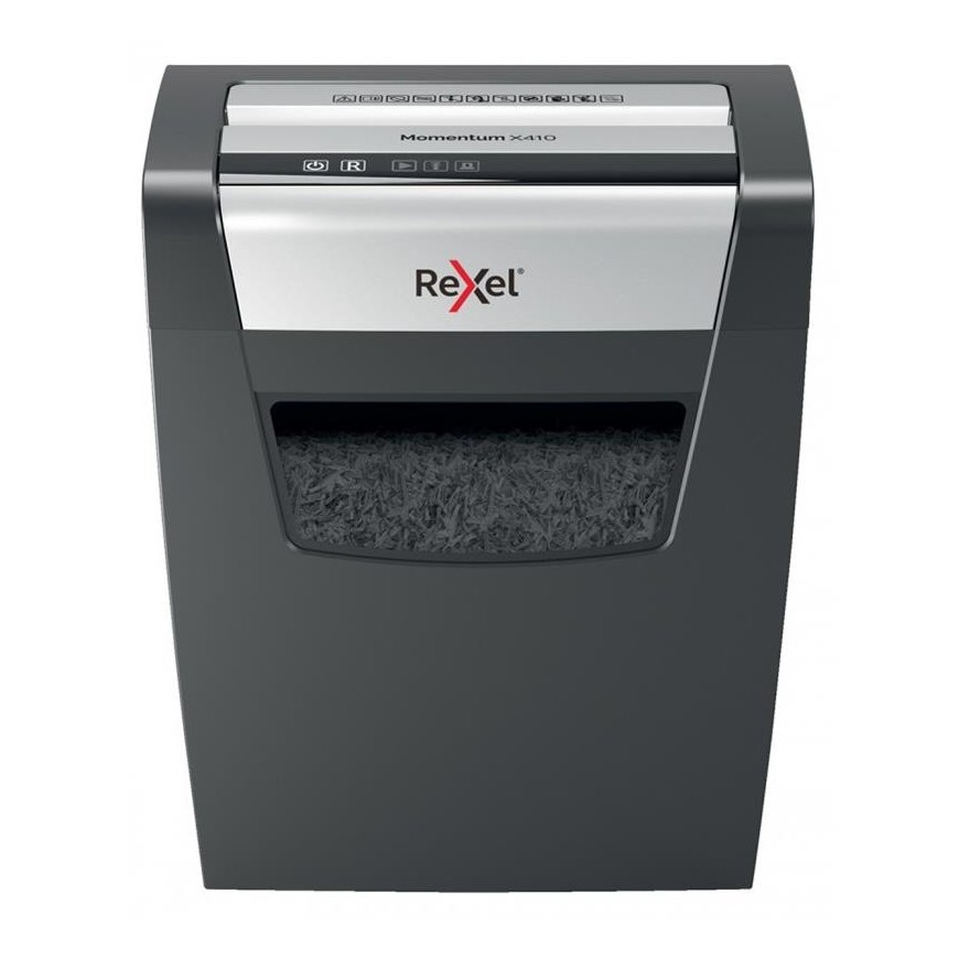 ¶La potencia para destruir mÇs! La destructora de papel Rexel Momentum X410 destruye hasta 10 hojas de una vez, funciona ininterrumpidamente durante 6 minutos y es ideal para uso domǸstico.