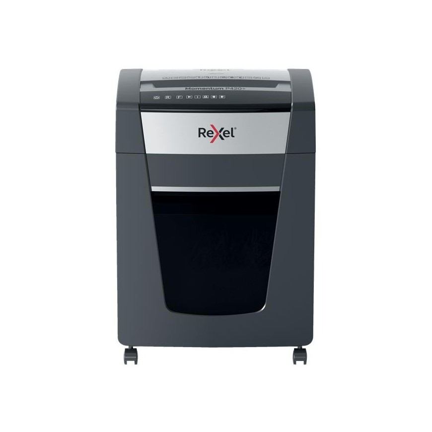 Las destructoras de papel sin atascos Rexel Momentum son ideales para destruir documentos confidenciales en la oficina. La destructora P420+ destruye hasta 20 hojas de papel A4 (80 grs) de una sola vez a través de la ranura de alimentación manual en partículas P-4 (4x35mm).