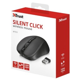 Cómodo ratón inalámbrico Mydo Silent Click de Trust con modernas teclas silenciosas, en color negro.