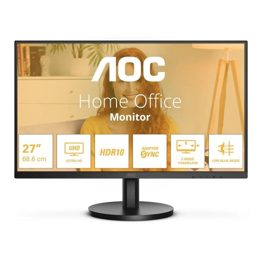 Monitor UHD 27" con panel VA, HDR10, AdaptiveSync y funciones de confort visual. Mejore su experiencia visual con el AOC U27B3M. Este monitor UHD 27" tiene un panel VA para contrastes profundos y frecuencia de actualización de 60Hz para imágenes fluidas. Imágenes claras gracias a la tecnología AdaptiveSync y compatibilidad con HDR10. El monitor tiene luz azul baja y tecnología sin parpadeos para una menor fatiga visual, facilitando un uso prolongado. La base estándar sencilla hace que este sea un monitor estable para tu espacio de trabajo.